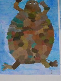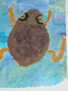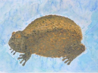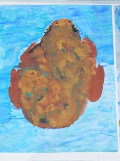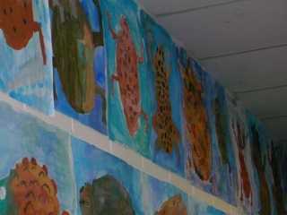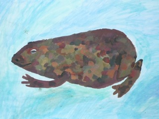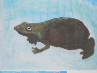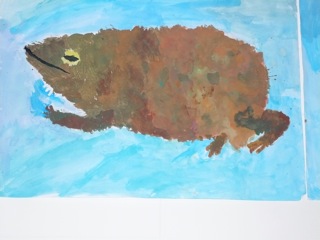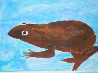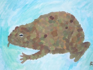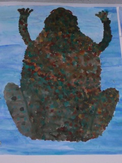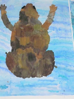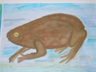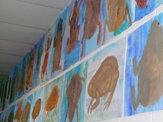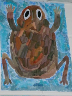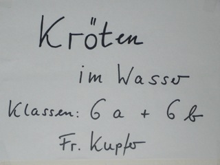 Grün-braune, warzige Kröten in klarem Wasser. Diese Bilder wurden im Kunstunterricht der Klassen 6a und 6b unter der Leitung von Frau Kupfer nass-in-nass gemalt. Die Bilder hängen im Erdgeschoss des Unterstufengebäudes.