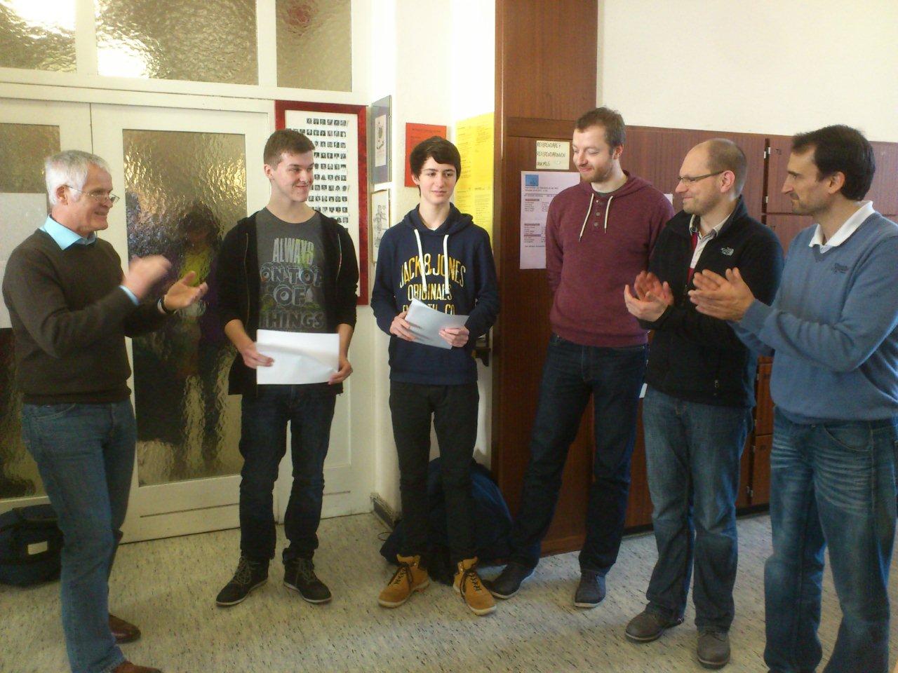 Für das herausragende Ergebnis sorgten Kolja Bauer und Christian Justus, die im Einzelwettbewerb den zweiten bzw. dritten Platz belegten. Als Preis erhielten beide einen Gutschein für eine Modellierungswoche im Wert von 600€, bei der reale mathematische Problemstellungen wie die Organisation von Verkehrsströmen in Städten behandelt werden.