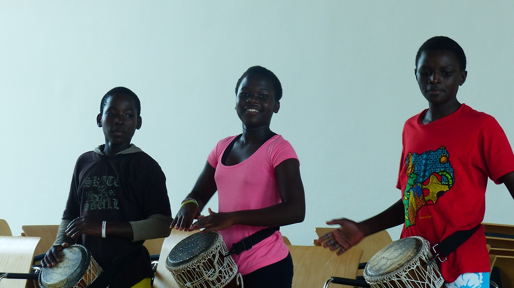 Ein besonderes Highlight war die KinderKulturKarawane, die genau zu den Projekttagen Station an der MLS machte und ein Projekt anbieten konnte. Die Teilnehmer lernten von den Jugendlichen und ihrem Betreuern aus Uganda trommeln und Ausdrucktanz, sie kochten gemeinsam und bastelten Perlenketten aus buntem Papier.