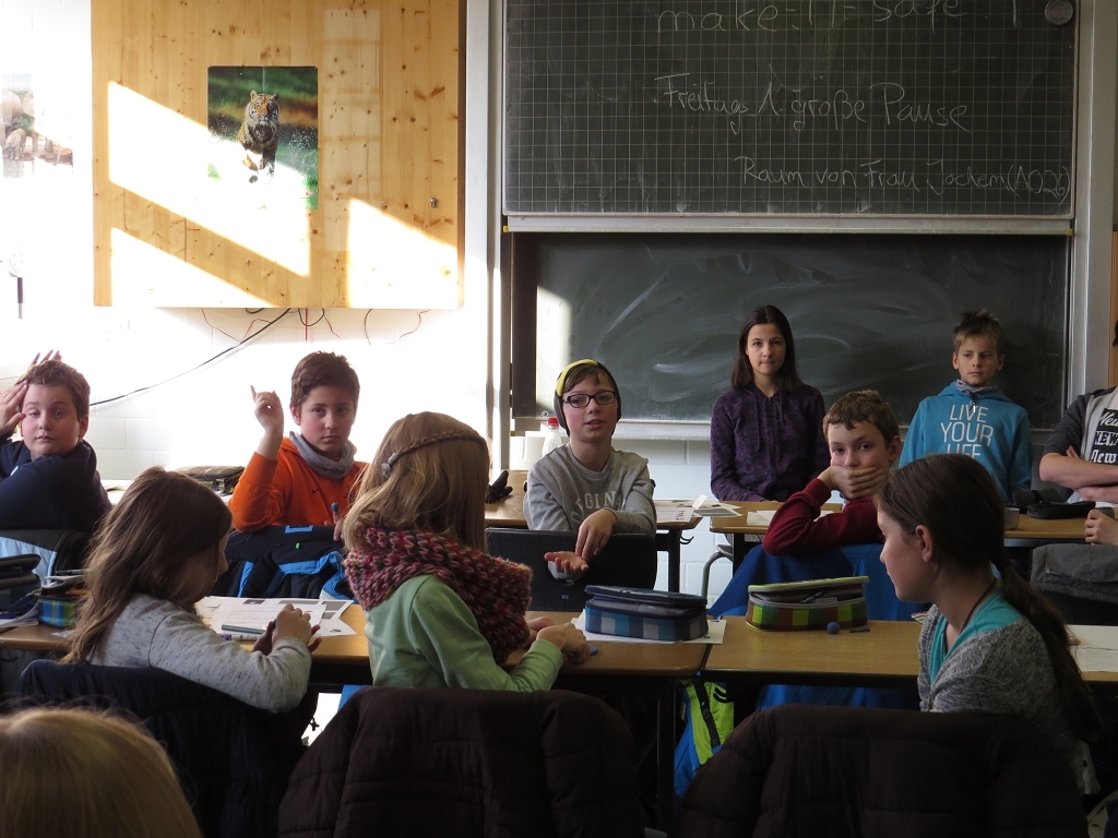 Nach ihrem ersten Peer-Workshop im September 2015 in München nahmen die vier „Neuen“ mit einer medienpädagogischen Trainingseinheit zum Thema „Posten und Chatten im Internet“ im gesamten Jahrgang 5 ihre Arbeit auf. Ziel der Einheit war, die jungen Schülerinnen und Schüler über Gefahren im Umgang mit Messengern und sozialen Netzwerken zu informieren. Dazu gab es zahlreiche Übungen, die sich unter anderen z.B. mit der Frage um das Recht am eigenen Bild und die Folgen von Veröffentlichungen eigener Bilder im Netz befassten. „Wir wollen besonders die jungen Schülerinnen und Schüler für die Gefahren sensibilisieren, die dadurch entstehen können, dass Informationen gepostet oder gechattet werden, die geheim bleiben sollten. Das gilt für Altersangaben, Telefonnummern und besonders Adressen“, so Höhbusch. Nicht selten verbergen sich hinter Chatpartnern ganz andere Personen, als man vermutet. Die Peers erklären, was zu tun ist, wenn man aufgefordert wird, ein Bild von sich hochzuladen oder eben gezielt auf seinen Wohnort oder die Schule ausgefragt wird. Die Kids der fünften Klasse bekommen handfeste Verhaltensregeln mit auf dem Weg, die es ihnen leichter machen, Gefahren zu erkennnen und mit verdächtigen Ansprachen umzugehen.