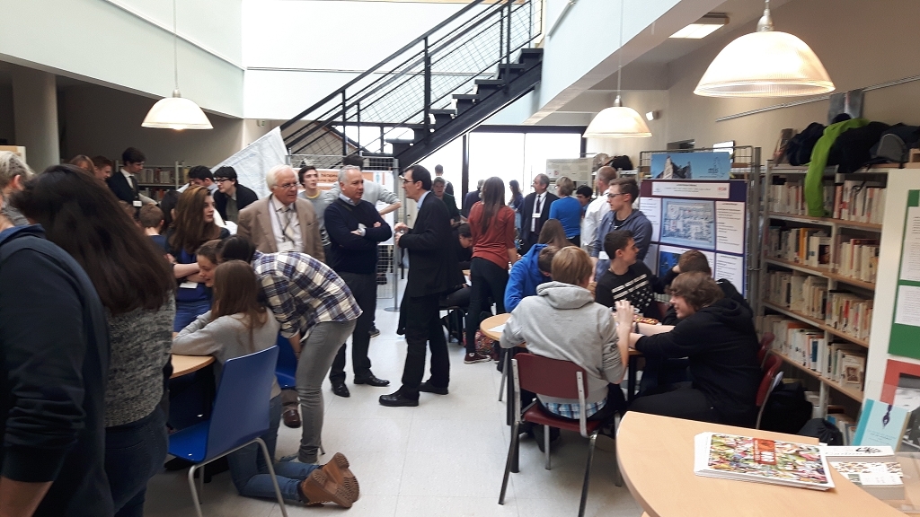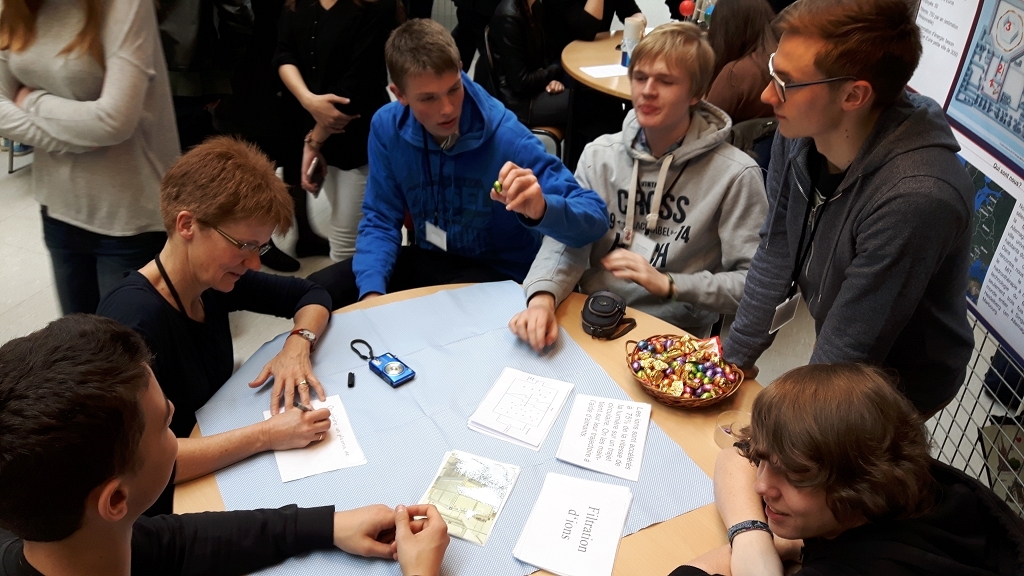 Nach den Vorträgen erwartete uns ein Nachmittagsprogramm. Dies begann mit einem Mittagessen an einem Lycée in Bastia. Anschließend fanden sich alle Gruppen in der Bücherei der Schule ein, wo sie ihre Stände aufbauten, an denen sich die Gruppen mit ihren Themen präsentierten, oft verbunden mit einer Art Quiz, in unserem Fall einem Puzzle mit den verschiedenen Stationen auf dem Weg der Ionen zum Patienten. Hier machten wir schon einige Bekanntschaften mit anderen Schülern.
