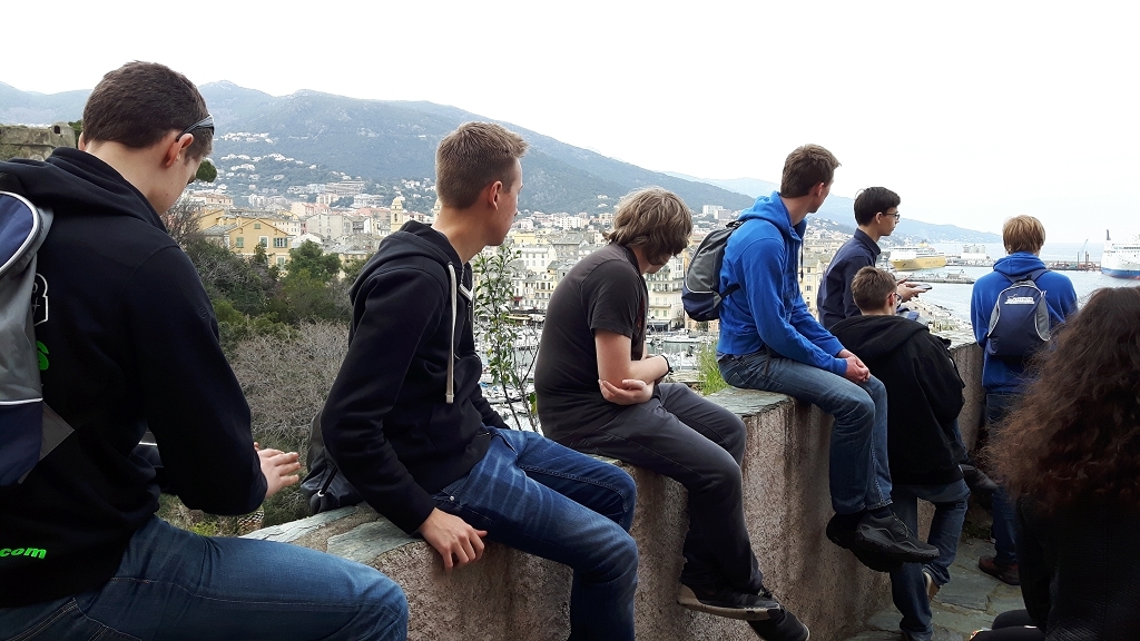 Am Sonntag, den 20.03. war es dann soweit: Früh morgens machten wir uns auf den Weg zum Frankfurter Flughafen, von dem eine Maschine nach Paris flog, von Paris starteten wir anschließend nach Bastia, Korsika. Wir waren in einem Drei-Sterne-Hotel untergebracht. Am nächsten Tag hielten wir unsere Präsentation in einem Vorlesungssaal neben anderen, ebenfalls auf Französisch gehaltenen Vorträgen. Insgesamt nahmen etwa 80 Schüler aus Frankreich, Weißrussland, der Ukraine, Moldavien und Deutschland an dem Projekt teil, am Mittwoch wurde eine Gruppe aus Fukushima (Japan) per Videochat zugeschaltet. Wir hörten Vorträge über unterschiedliche Bereiche des Strahlenschutzes, beispielsweise der Entsorgung radioaktiven Mülls in Krankenhäusern oder die Menge der Strahlung, der Piloten ausgesetzt sind. Einige Vorträge waren szenisch gestaltet, mehrere Schülergruppen lasen ihre Texte eher ab, andere sprachen sehr frei.