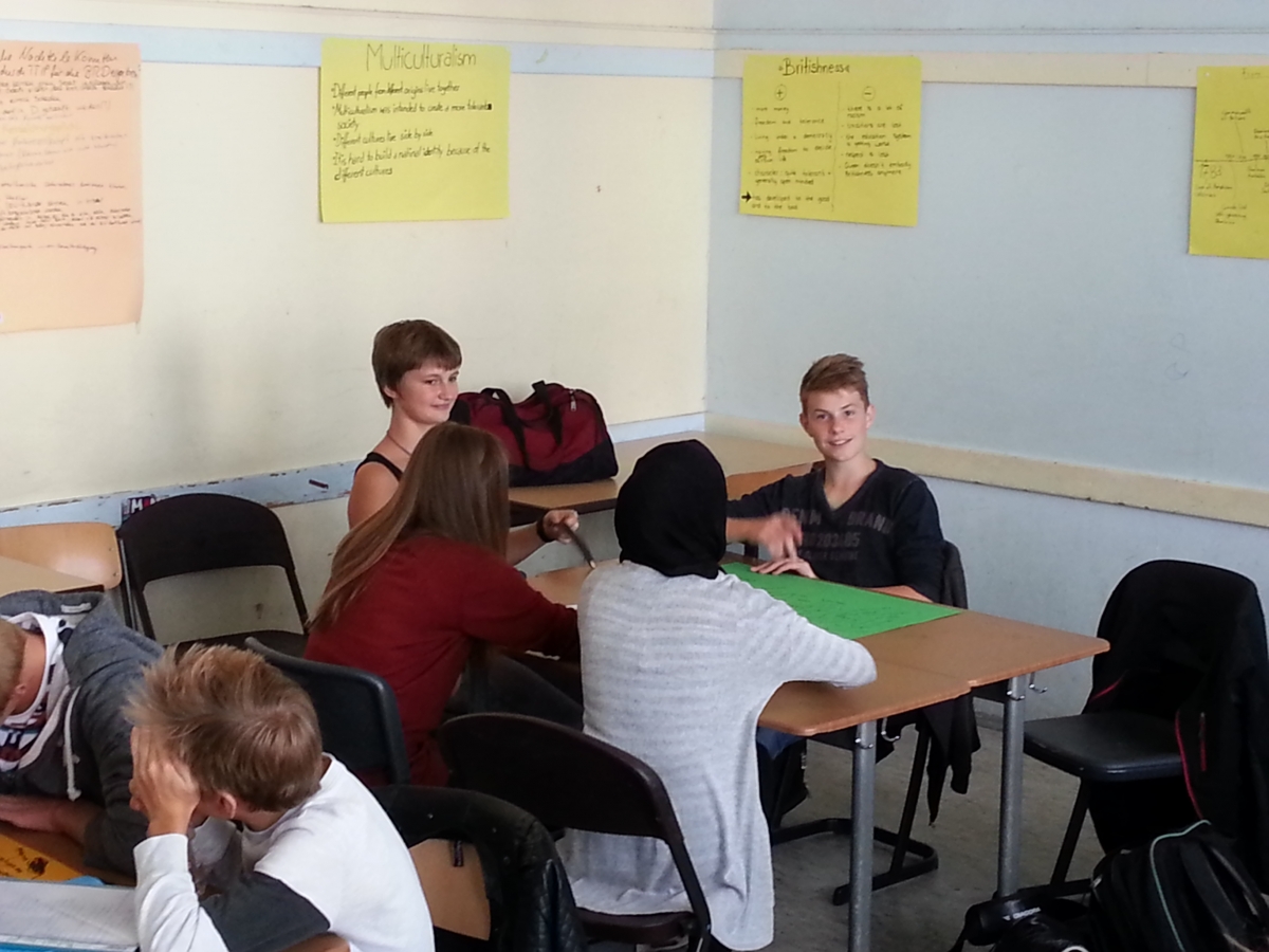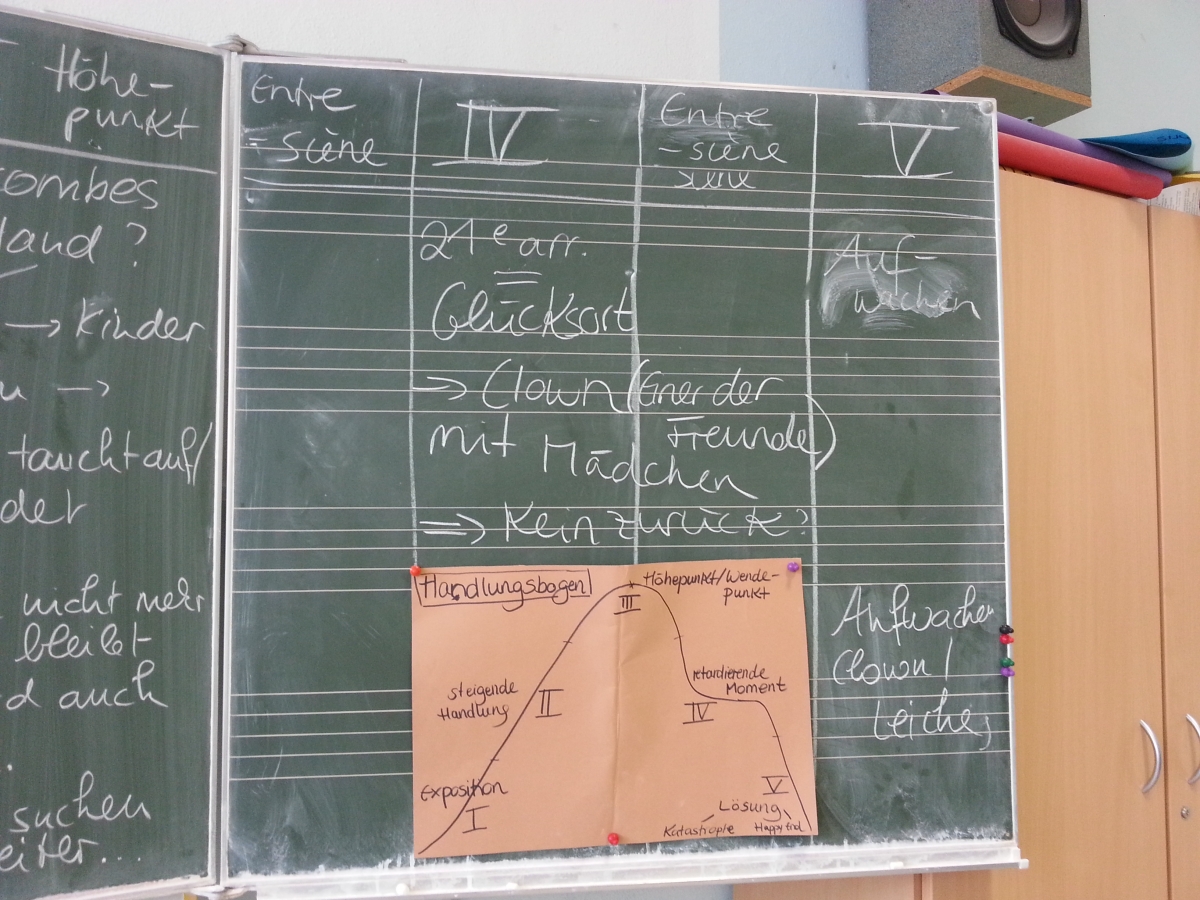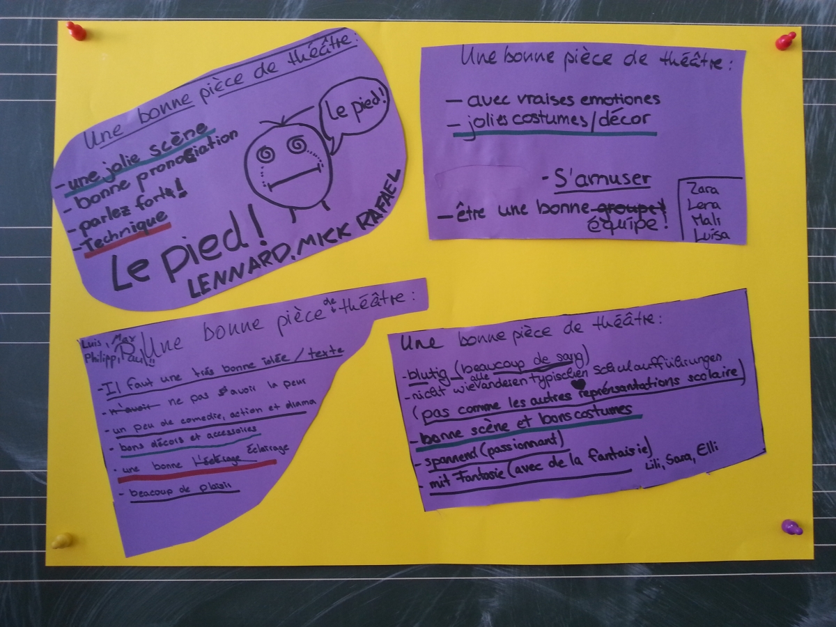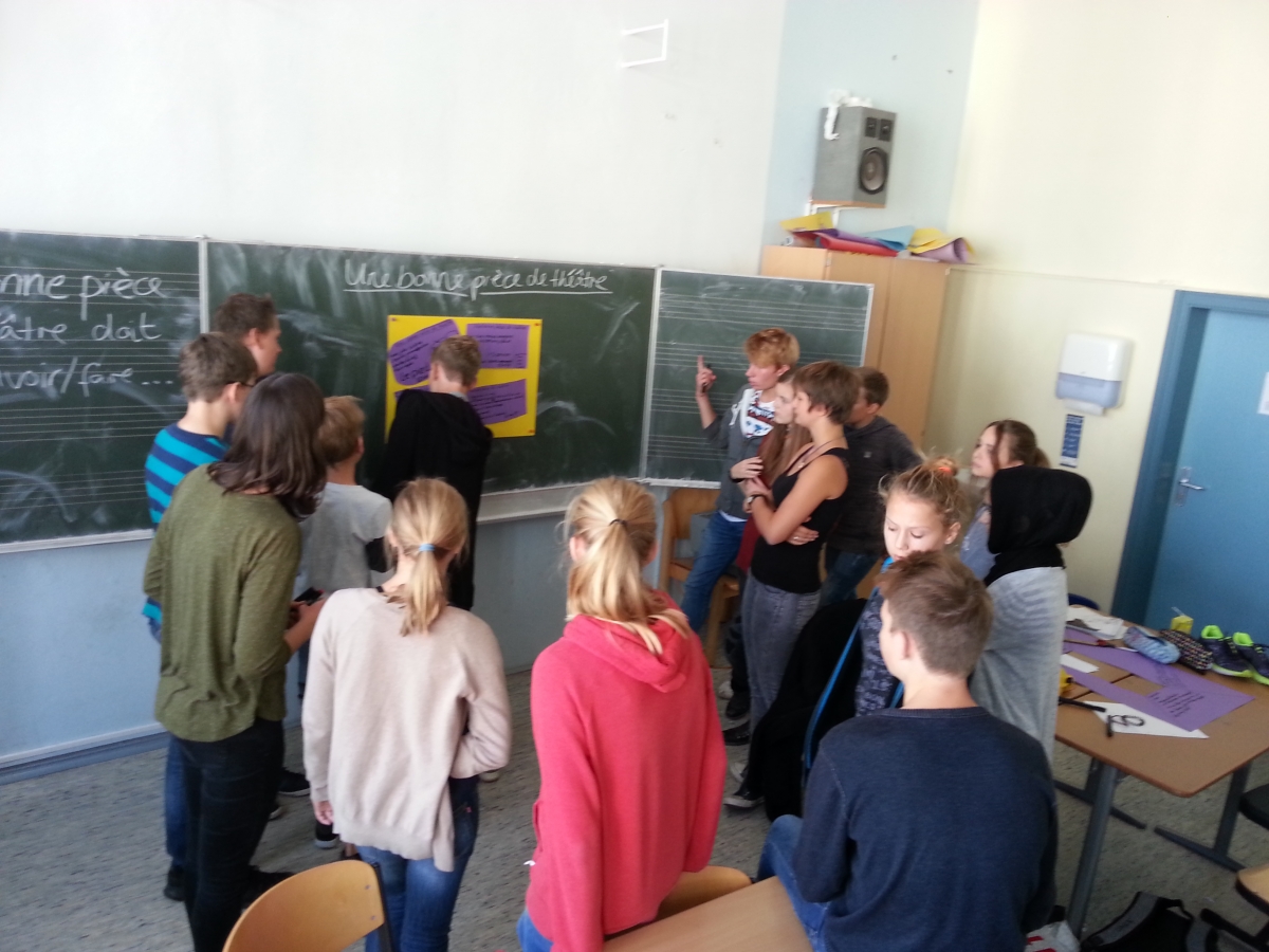 Im Folgenden erarbeiteten die SuS in vier kleinen Gruppen jeweils ein grobes Szenario, aus denen das Plenum das schlüssigste, auch in Bezug auf die praktische Umsetzung, auswählte. Auch das Personal wurde festgelegt. Nun ging es an das Schreiben der einzelnen Szenen auf Französisch – diesmal in fünf kleinen Gruppen, da ein ordentliches Stück ja schließlich aristotelisch aufgebaut sein sollte. Hier gaben wir Lehrer hin und wieder sprachliche Hilfestellung. Das Schreiben der Szenen dauerte unterschiedlich lang, und diejenigen, die schon schnell fertig waren, machten sich schon Gedanken für das Bühnenbild und die Requisiten.