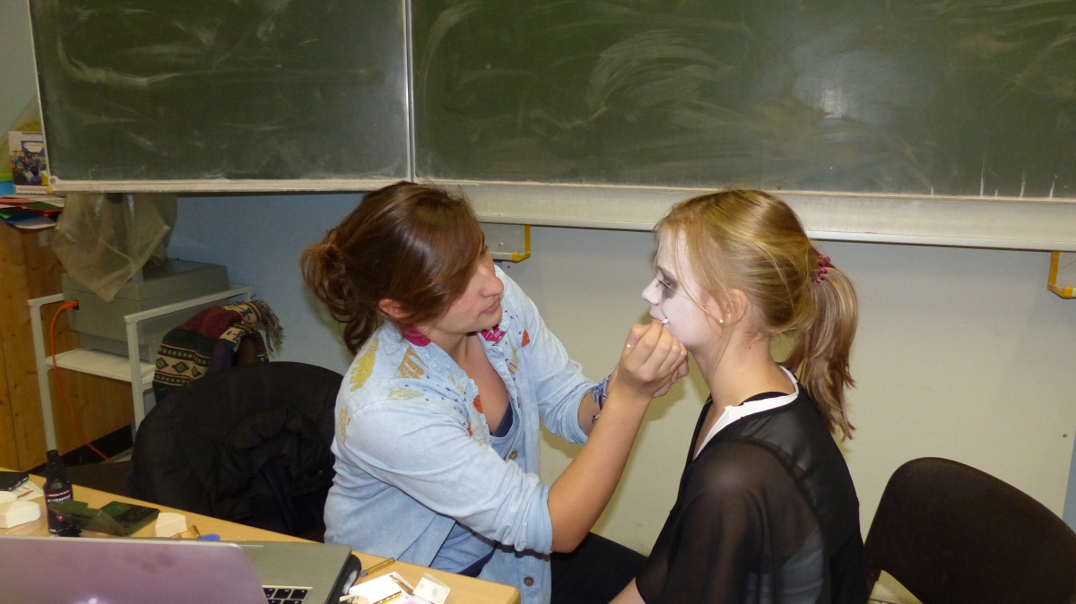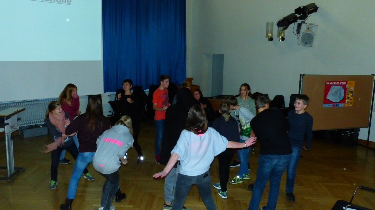 Nachdem wir die Genehmigung der Schulleitung und der Eltern eingeholt hatten, ging es nach den Sommerferien 2015 frisch ans Werk. Frau Girard hatte selbst als Laiendarstellerin schon einiges an Erfahrung und vor allem viele gute Ideen, so dass wir zu Stundenbeginn meist mit praktischen Sprech- und Ausdrucksübungen begannen. Auf diese Weise motiviert, nahmen die Schülerinnen und Schüler auch die anstehenden Hürden. Zunächst überlegten wir gemeinsam, wie ein gutes Theaterstück sein sollte: unterhaltsam und spannend. Dann gaben wir die drei Begriffe „Paris“, „crime“ (Verbrechen) und „échange“ (Austausch) vor, um die Vorschläge für ein Szenario inhaltlich zu begrenzen.