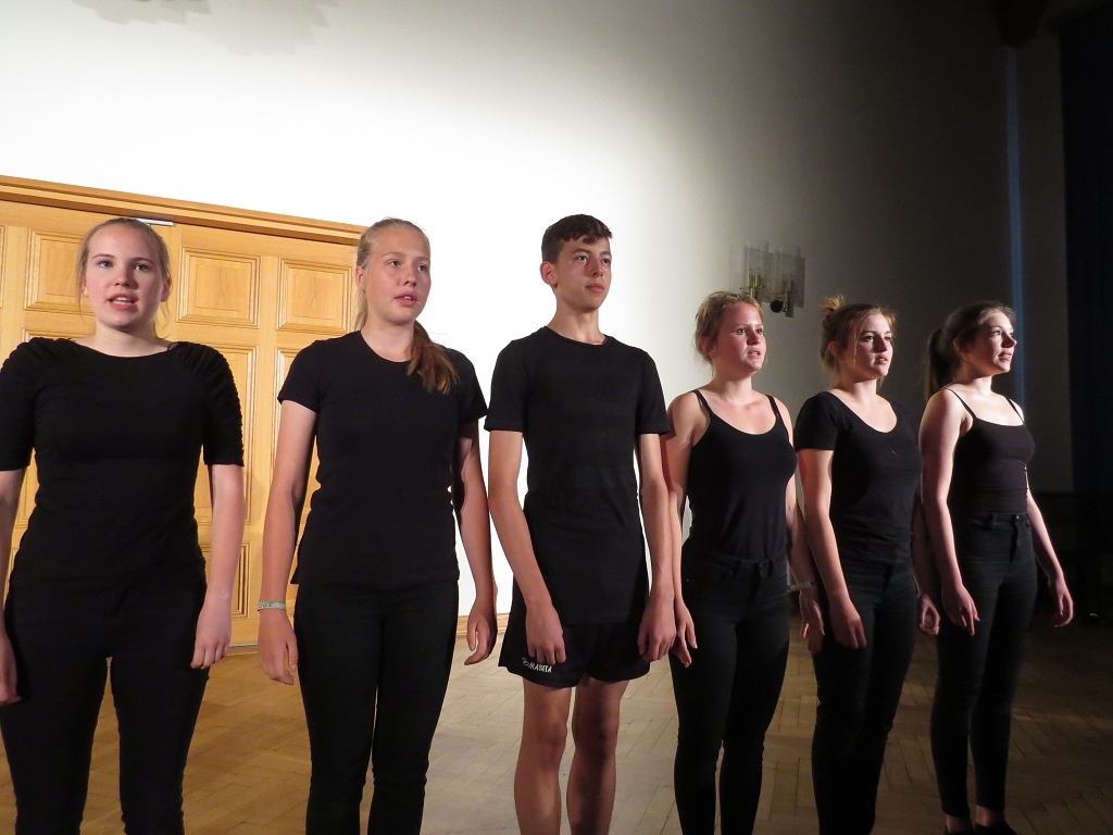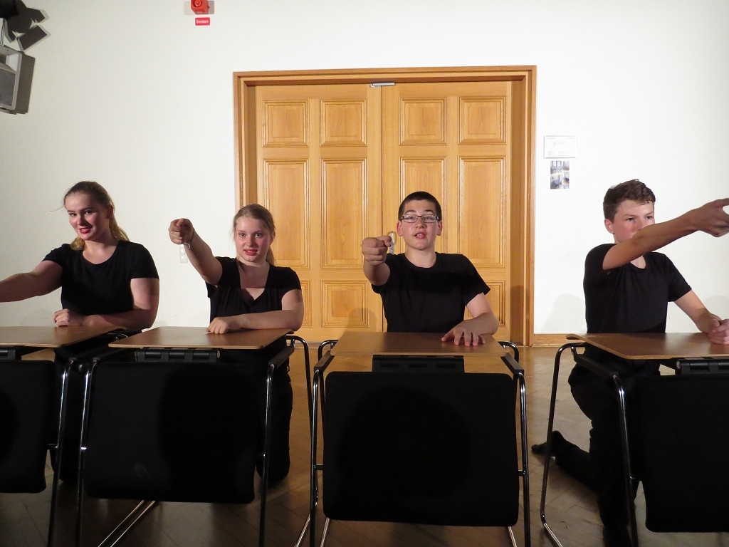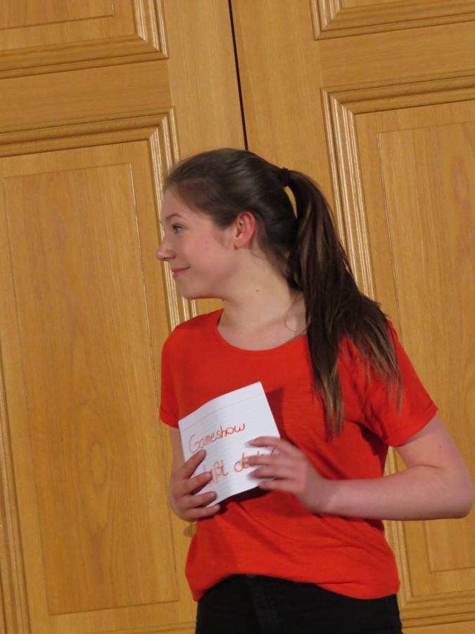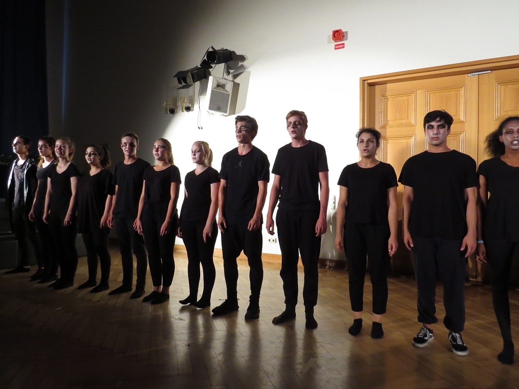 Der Theaterabend zum Schuljahresabschluss wurde diesmal von vier unterschiedlichen Ensembles gestaltet. Den Auftakt zu einem alles andere als harmlosen Abendvergnügen gab die Theater-AG der Unterstufe unter der Leitung von Ariane Kolckmann. Lady Cecilia de Canterville, gespielt von Yara Fritzenwalder, versucht seit Jahren vergeblich zu schlafen und schaut, mehr als nur leicht neidisch, auf die arglos schlafende Familie Otis. Kettenrasseln und „huh-huh“ -Rufe versetzen die Besucher aus Amerika leider überhaupt nicht in Angst und Schrecken, im Gegenteil: Die Töchter der Familie freunden sich mit der alten Gespensterdame an und sind ihr am Ende bei der Erfüllung ihres größten Wunsches behilflich. Y. Fritzenwalder brilliert in der Rolle der Lady Cecilia und versetzt das Publikum mit ihren bravourösen Monologen in Erstaunen! Mit perfekt nach Werbemanier gesprochener „Produktplatzierung“ nimmt die Produktion nebenbei die Kommerzialisierung in der darstellenden Kultur komödienhaft aufs Korn. Musikalisch wurde die Geschichte um Lady Cecilia vom Unterstufenchor unter der Leitung von Frau Prigge unterstützt.