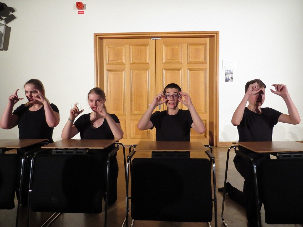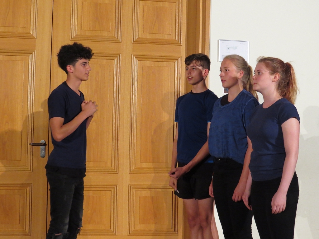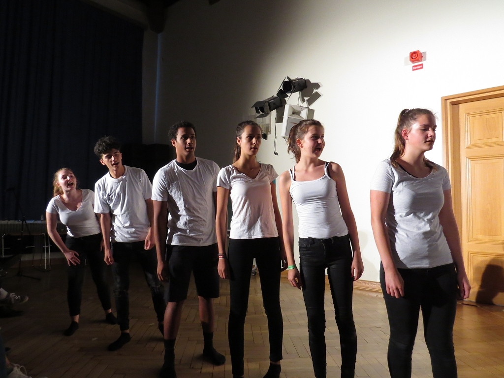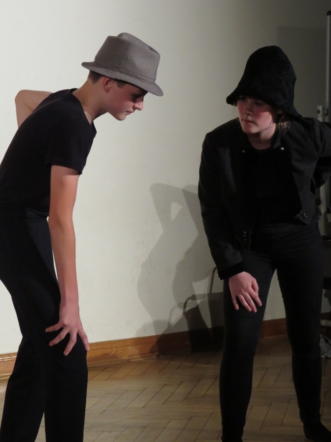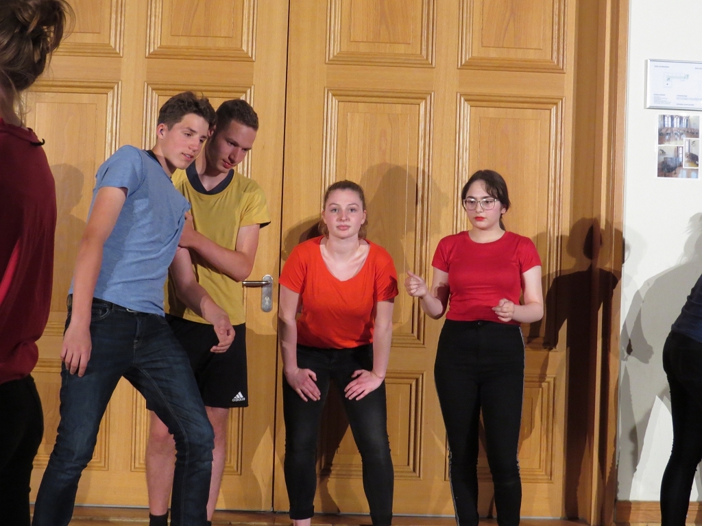 Der Theaterabend zum Schuljahresabschluss wurde diesmal von vier unterschiedlichen Ensembles gestaltet. Den Auftakt zu einem alles andere als harmlosen Abendvergnügen gab die Theater-AG der Unterstufe unter der Leitung von Ariane Kolckmann. Lady Cecilia de Canterville, gespielt von Yara Fritzenwalder, versucht seit Jahren vergeblich zu schlafen und schaut, mehr als nur leicht neidisch, auf die arglos schlafende Familie Otis. Kettenrasseln und „huh-huh“ -Rufe versetzen die Besucher aus Amerika leider überhaupt nicht in Angst und Schrecken, im Gegenteil: Die Töchter der Familie freunden sich mit der alten Gespensterdame an und sind ihr am Ende bei der Erfüllung ihres größten Wunsches behilflich. Y. Fritzenwalder brilliert in der Rolle der Lady Cecilia und versetzt das Publikum mit ihren bravourösen Monologen in Erstaunen! Mit perfekt nach Werbemanier gesprochener „Produktplatzierung“ nimmt die Produktion nebenbei die Kommerzialisierung in der darstellenden Kultur komödienhaft aufs Korn. Musikalisch wurde die Geschichte um Lady Cecilia vom Unterstufenchor unter der Leitung von Frau Prigge unterstützt.