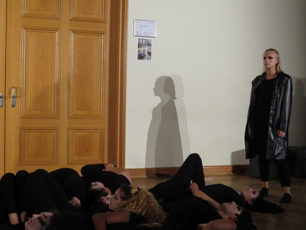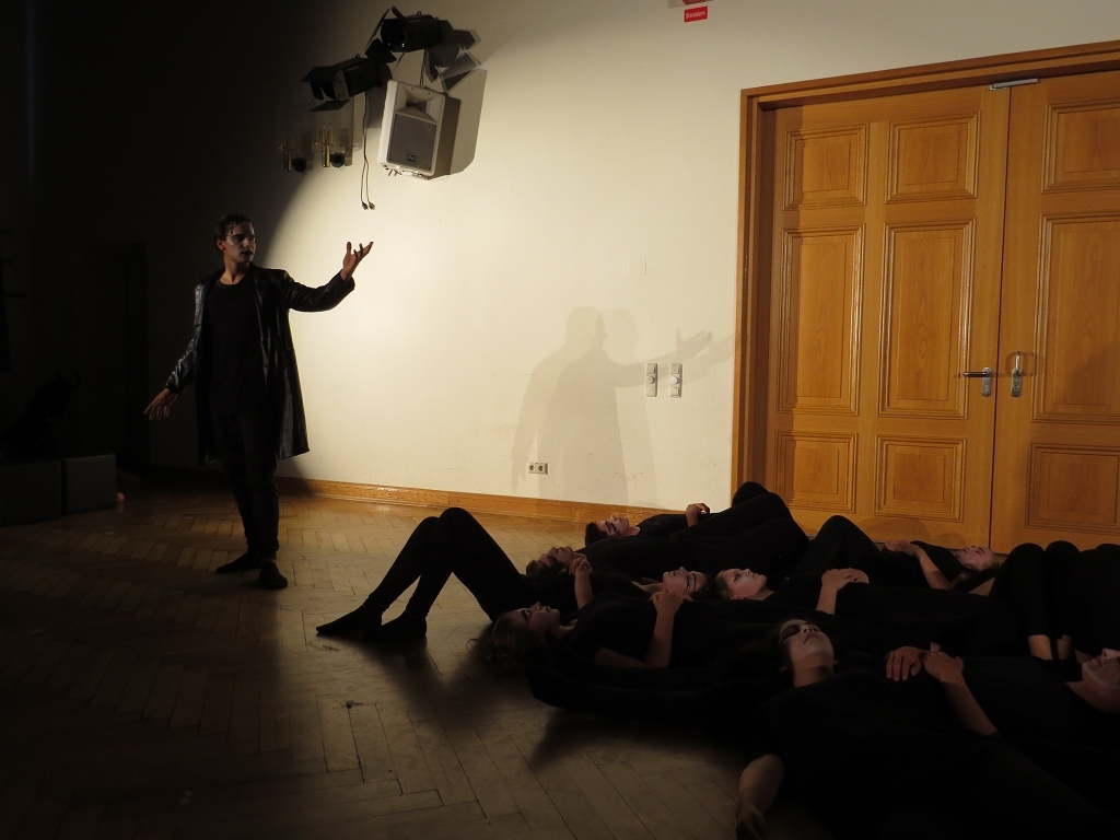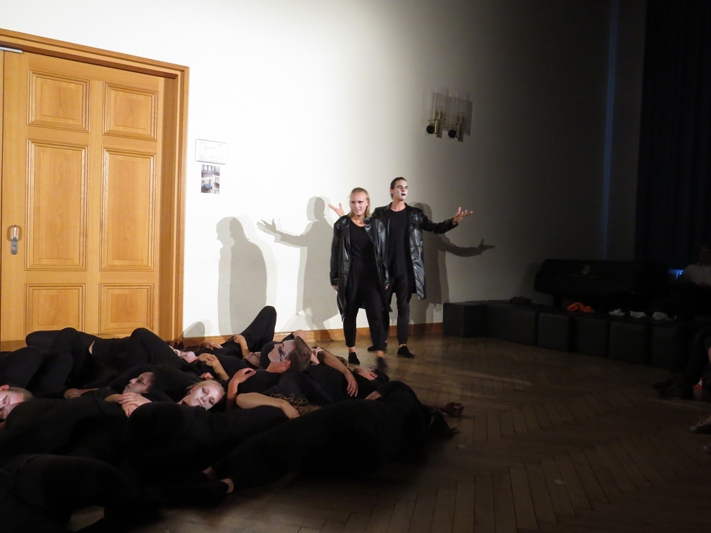 Die Szenecollage „Die Kunst des Spiels“ des DS-Kurses der E-Phase unter der Leitung von Frau Meichsner-Hoffmann widmete sich den vielfältigen Aspekten des Erwachsenwerdens. Szenen mit „Großen Gefühlen“ wechselten zu solchen mit Melancholie und Langeweile, oder rasanter Hektik, und regten die Zuschauer zum Nachdenken über das jeweilige Szenen-Setting an. Dass die wild umher jagenden Jugendlichen z.B. eine Kugel im Flipperautomaten spielten, wurde nicht auf den ersten Blick klar. Die zahlreichen Eindrücke der Szenen führten selten zu schneller Erkenntnis beim Zuschauer, was den Reiz des Zuschauens eindeutig steigerte. Ob Zapping im Fernsehen oder in Liebesbeziehungen, ob überdrehtes verbales Phrasendreschen oder Abhängen vor idiotischen Gameshows: Sowohl witzige als auch tiefgründige Ideen für die szenische Umsetzung bescherten den Zuschauern zahlreiche Schmunzelmomente, in denen man sich gern oder eben ungern an sein eigenes Heranwachsen erinnerte.