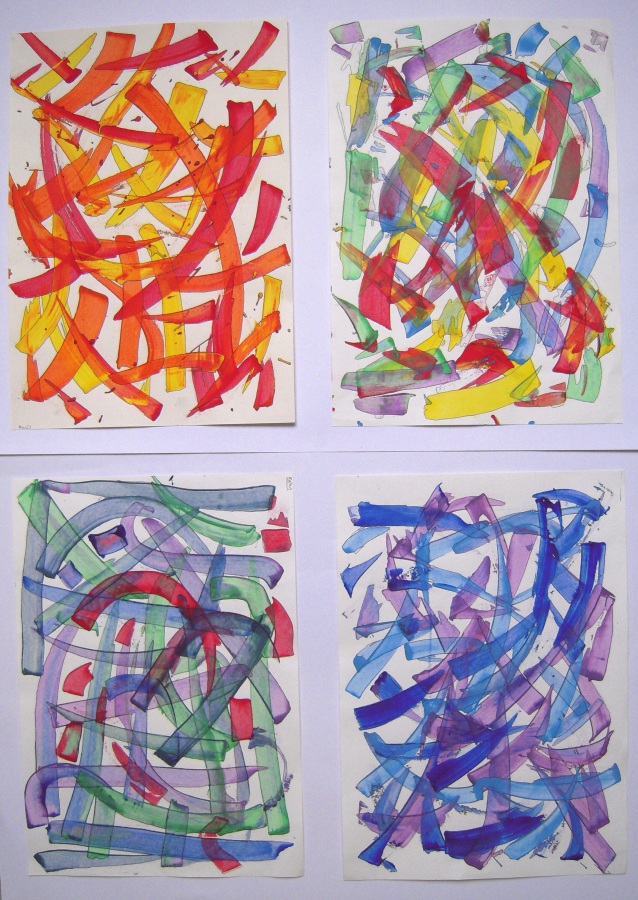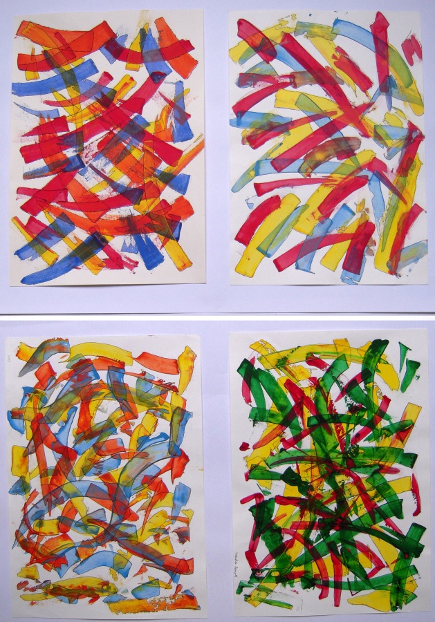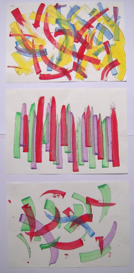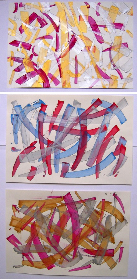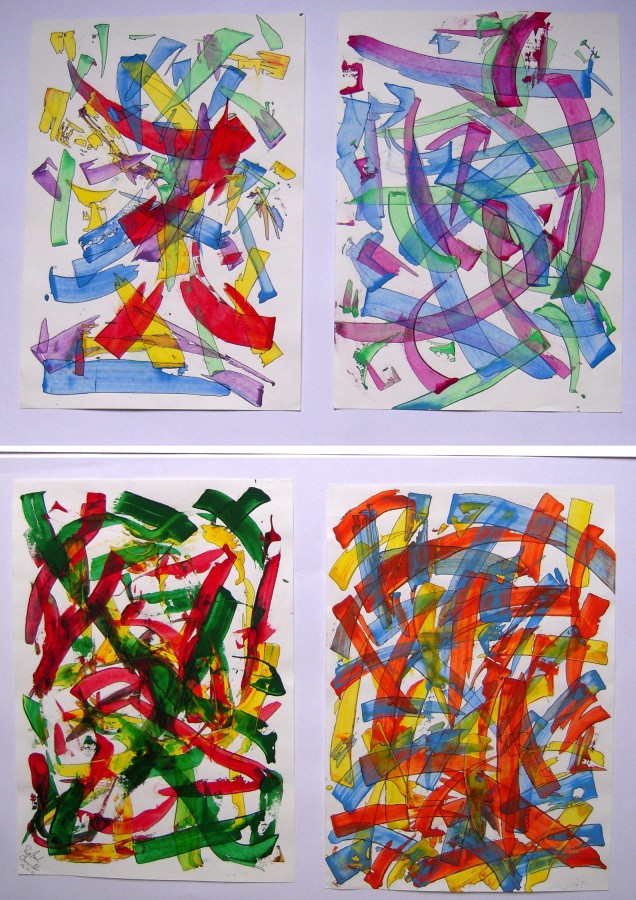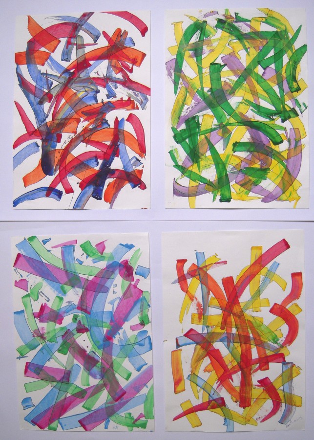 Dazu wurden verschieden breite Pappkanten in Acrylfarbe getunkt und Spuren auf Papier gebracht. Bewegungsrichtung, Streifenbreite sowie die Kombination unterschiedlicher Farben führten zu dynamischen Farb- und Formkompositionen.