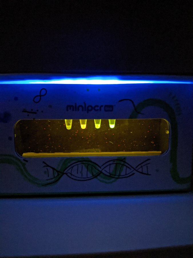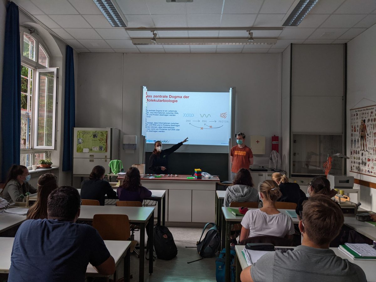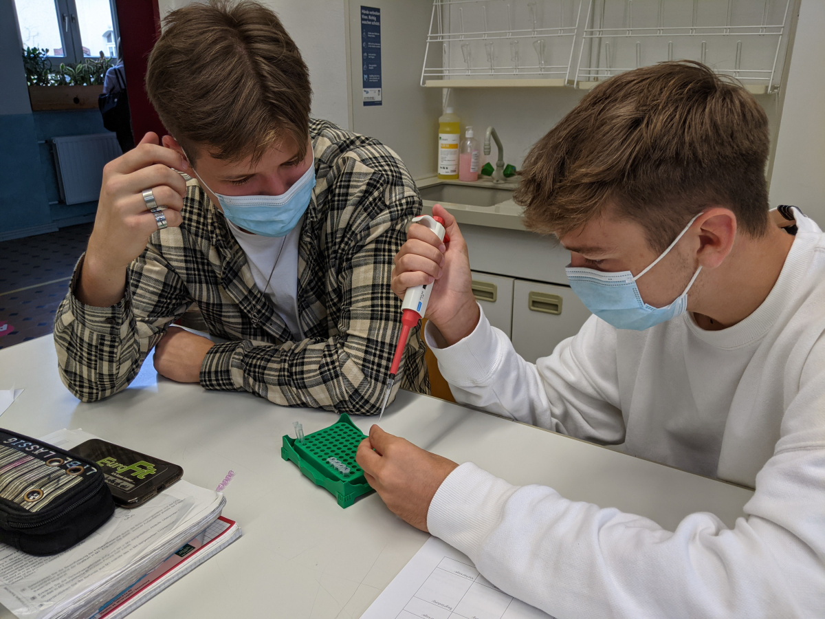 Da die Prozesse Transkription und Translation auf molekularer Ebene ablaufen, lassen sie sich mit dem bloßen Auge natürlich nicht beobachten. Dennoch sind sie fester Bestandteil der Biologie in der Oberstufe. Der Leistungskurs Biologie Q3 hatte nun die Chance diese beiden molekulargenetischen Prozesse im Klassenzimmer beobachten zu können. Dazu kamen am Dienstag, den 7. September und Freitag, den 10. September drei Studierende des iGEM-Teams Marburg an die MLS. iGEM ist ein jährlich stattfindender Wettbewerb der synthetischen Biologie für Studierende. Das iGEM-Team Marburg 2021 forscht an zellfreien Systemen rund um die Proteinbiosynthese. Mit einem solchen System lassen sich Transkription und Translation sichtbar machen. Durch zugegebene Fluoreszenz-Farbstoffe und entsprechende DNA-Abschnitte können die beiden Prozesse durch ein grünes bzw. rotes Leuchten unabhängig voneinander gezeigt werden. Die Schüler*innen des Biologie-LK pipettierten nach einer kurzen Einführung in die Handhabung der Eppendorf-Pipette vier verschiedene Ansätze. Die Ergebnisse konnten zum Teil sofort, zum Teil nach drei Tagen unter UV-Licht beobachtet und ausgewertet werden. Angeleitet wurden die Schüler*innen durch die Studierenden des iGem-Teams. Alle notwendigen Geräte und Materialien wurden der Martin-Luther-Schule vom iGEM-Team bereitgestellt.