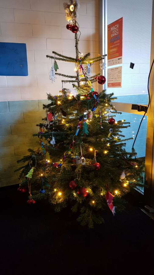 Auch in diesem Jahr hatte die Mädchen-AG der 5ten und 6ten Klasse das Glück, den Tannenbaum im B-Gebäude schmücken zu dürfen. Mit selbst gebastelten Anhängern und Makramee-Engeln, erstrahlt er seit Anfang Dezember im Licht von Kerzenschein.