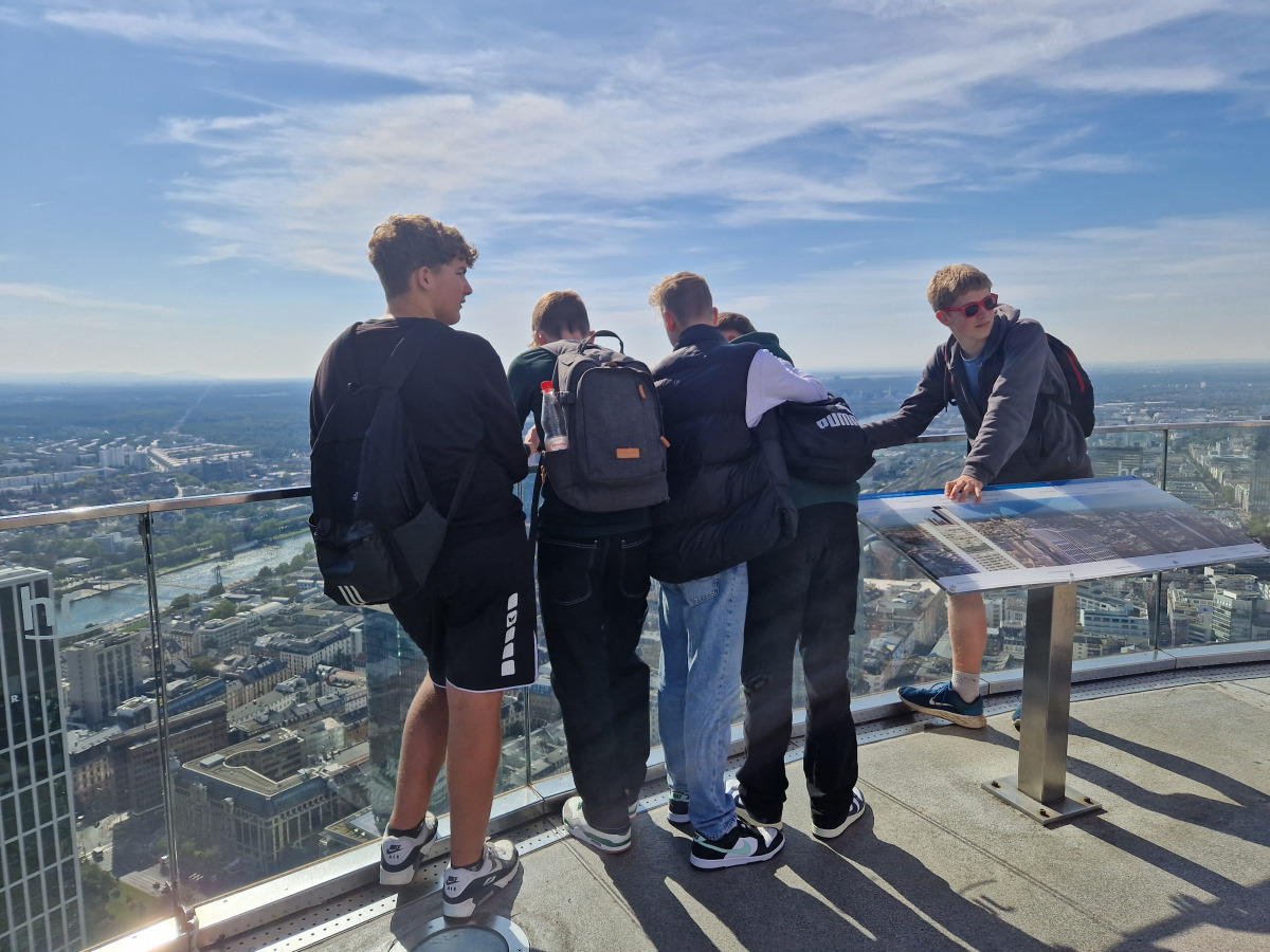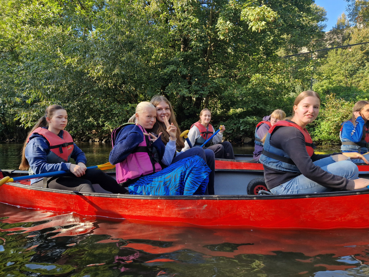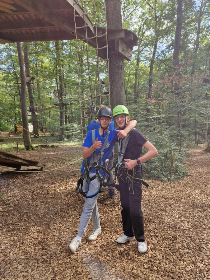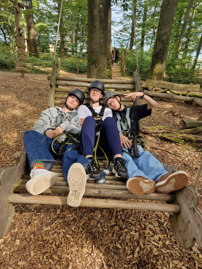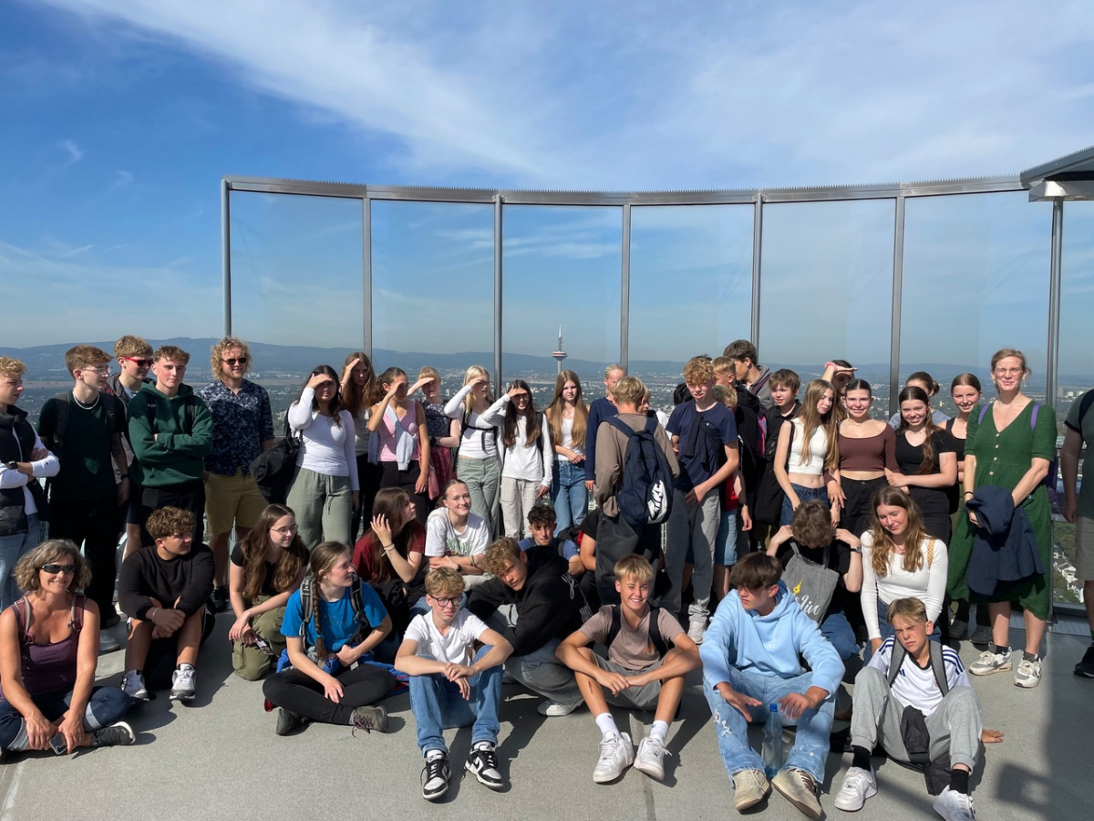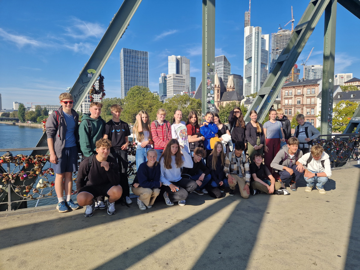 Am Dienstag sind wir mit dem Kanu auf der Lahn gepaddelt und haben auf den Afföllerwiesen gepicknickt. Am nächsten Tag waren wir im Kletterwald. Und für unser Thema, den ökologischen Fußabdruck, sind wir die zwei Stunden dorthin gelaufen. Unseren letzten gemeinsamen Tag verbrachten wir in Frankfurt. Auf dem Maintower sahen wir uns die Stadt von oben an und in der „Schirn“ die Ausstellung „Plastic World“. Danach durften wir shoppen. Leider mussten wir uns am Freitag schon verabschieden, aber wir freuen uns schon auf unser Wiedersehen in Måløv. Von Charlotte, Jona und Lenya.
