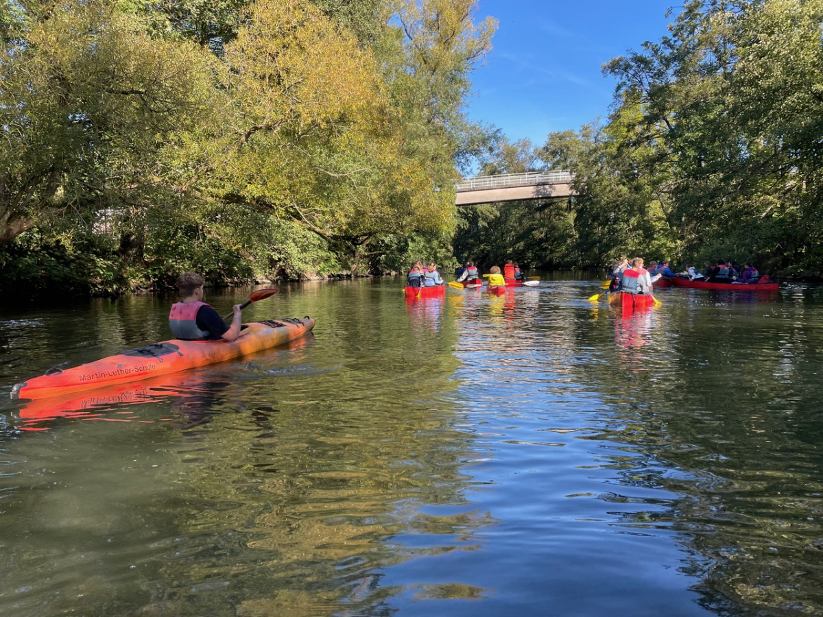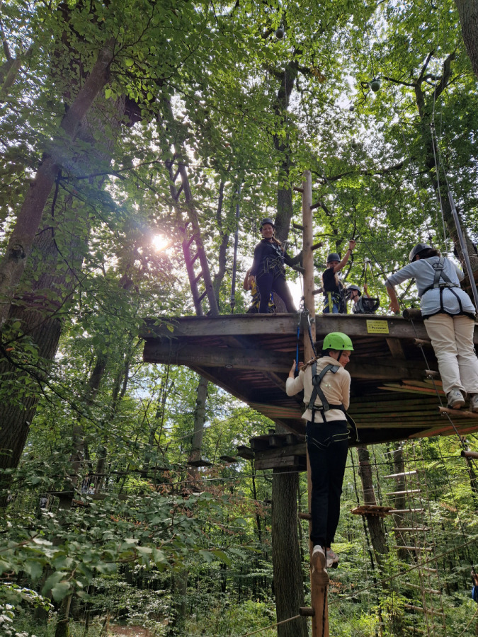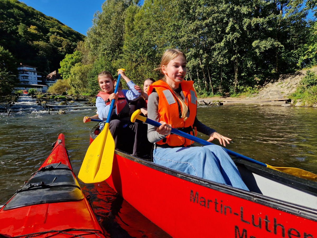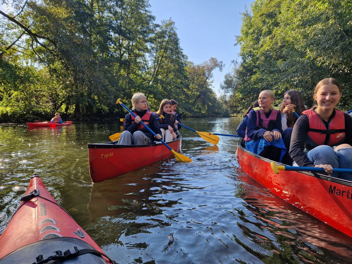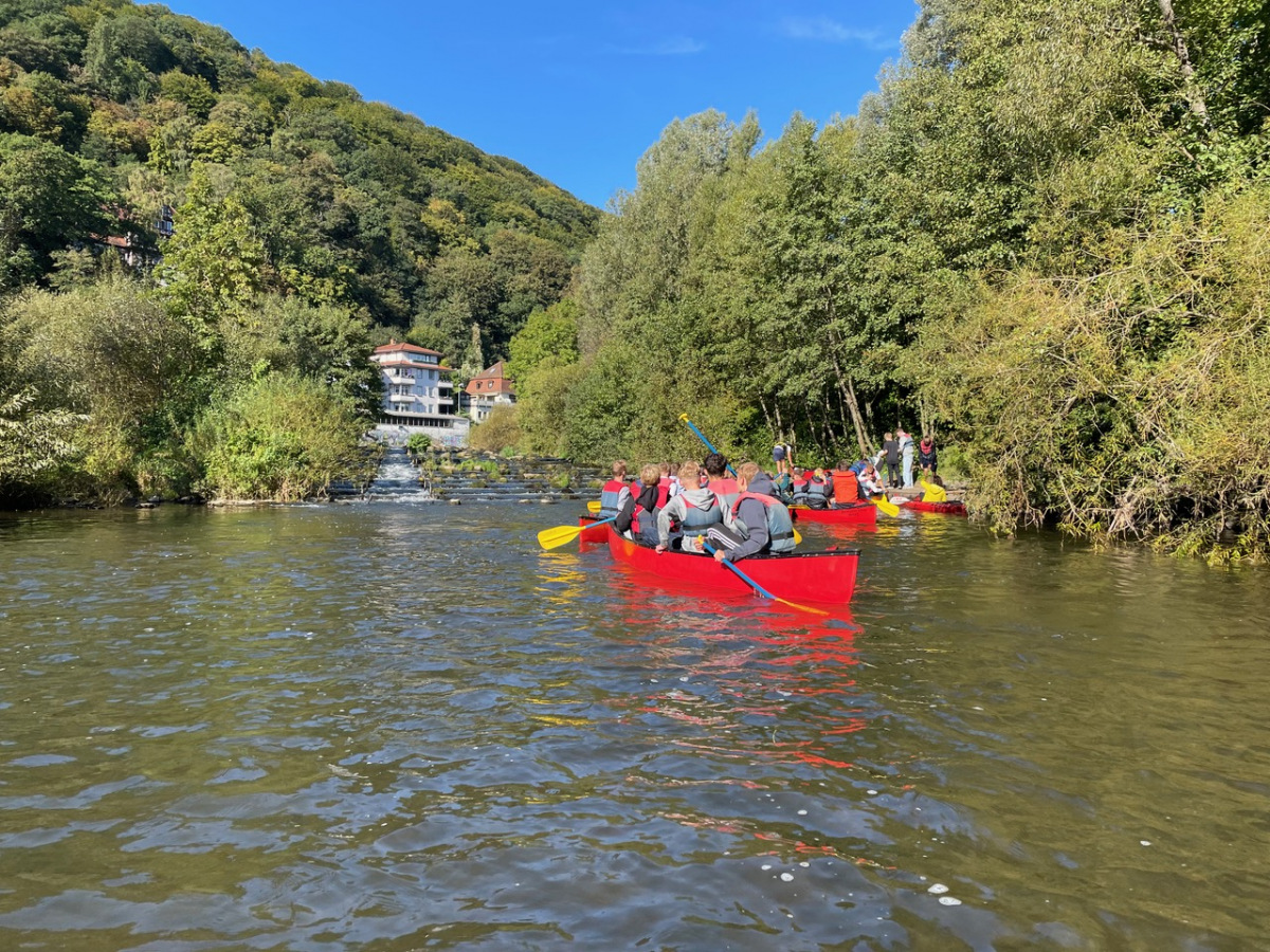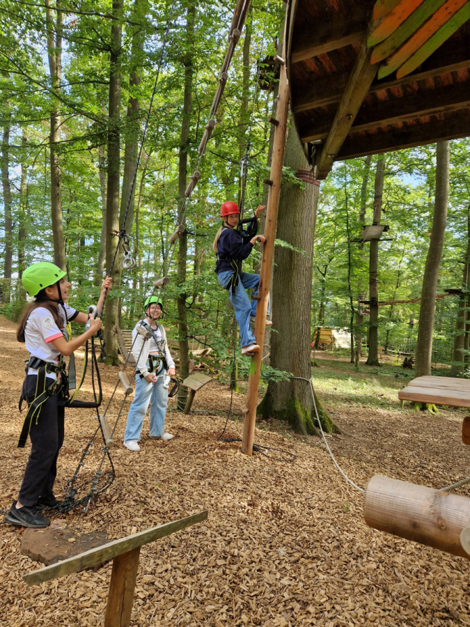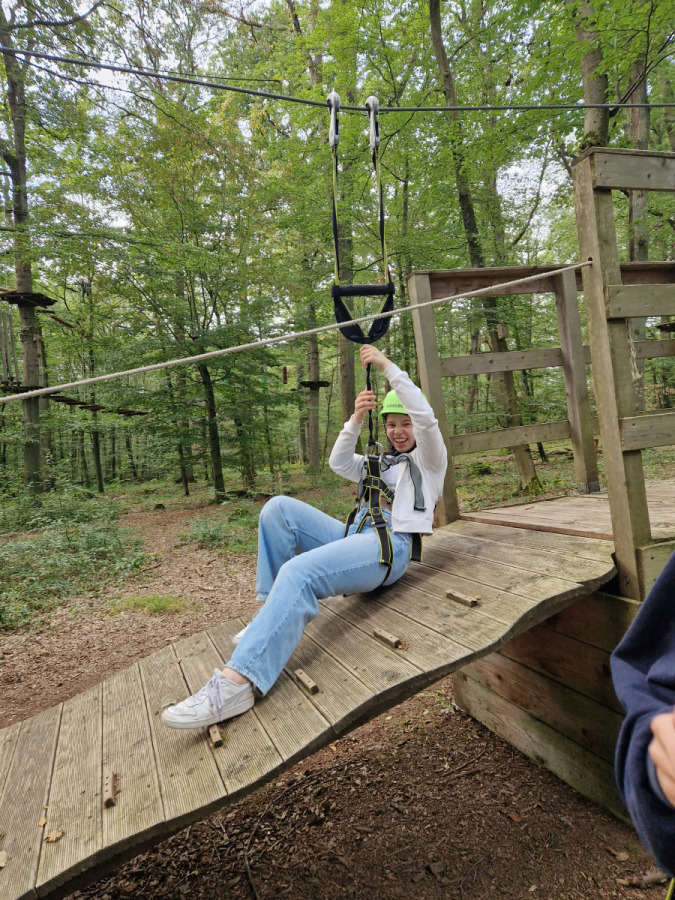 Am Dienstag sind wir mit dem Kanu auf der Lahn gepaddelt und haben auf den Afföllerwiesen gepicknickt. Am nächsten Tag waren wir im Kletterwald. Und für unser Thema, den ökologischen Fußabdruck, sind wir die zwei Stunden dorthin gelaufen. Unseren letzten gemeinsamen Tag verbrachten wir in Frankfurt. Auf dem Maintower sahen wir uns die Stadt von oben an und in der „Schirn“ die Ausstellung „Plastic World“. Danach durften wir shoppen. Leider mussten wir uns am Freitag schon verabschieden, aber wir freuen uns schon auf unser Wiedersehen in Måløv. Von Charlotte, Jona und Lenya.