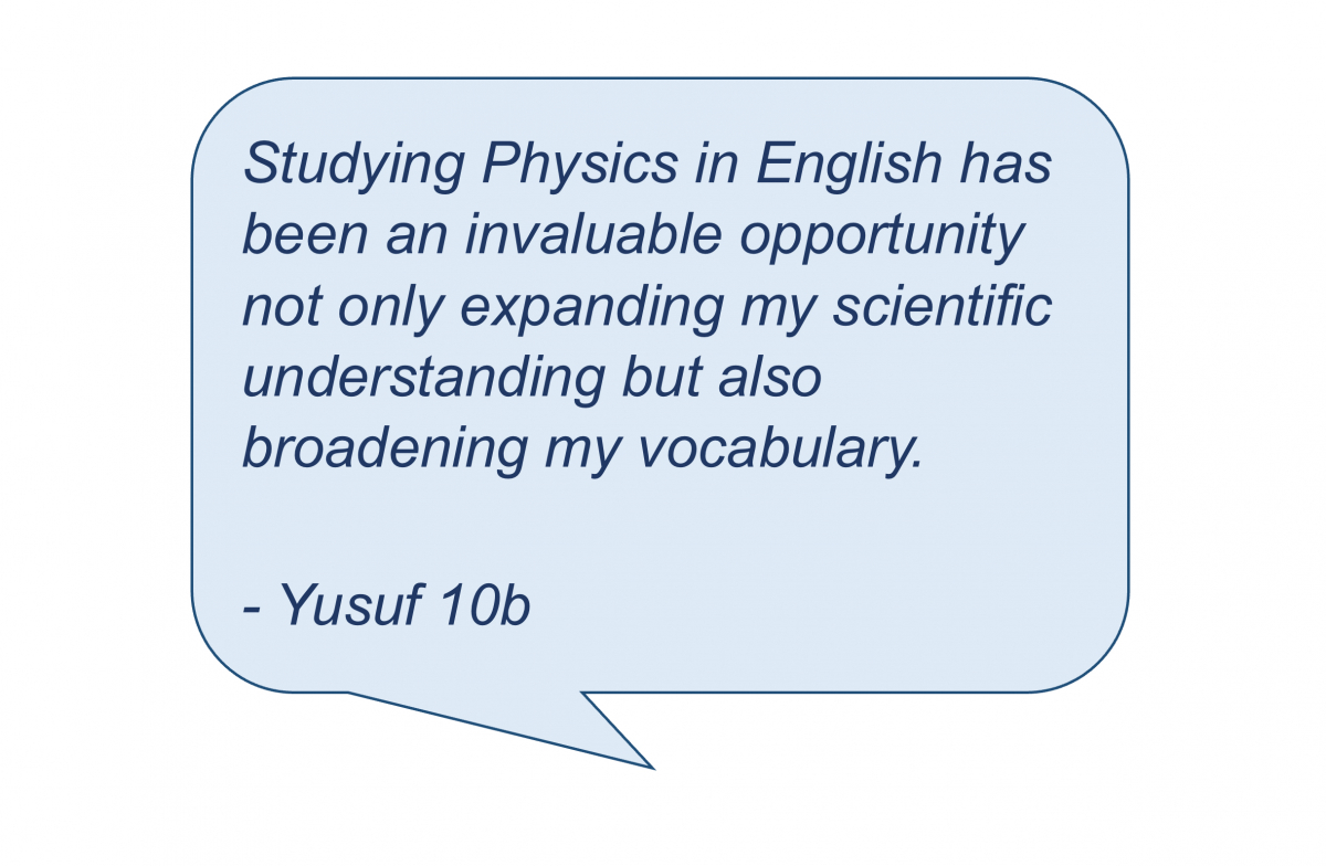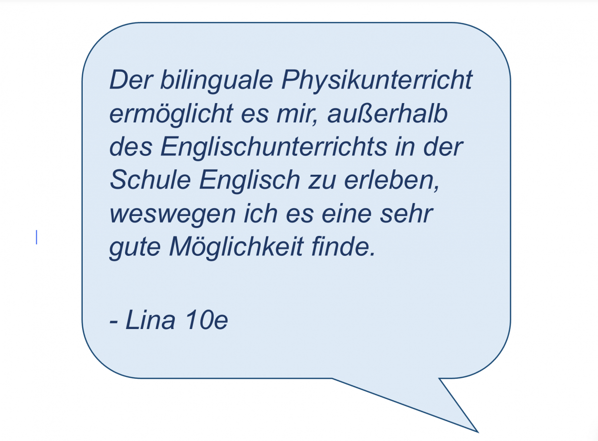 Den Schülerinnen und Schülern fällt das Kommunizieren in der Fremdsprache leicht, wobei in der Regel nur kleine Vokabelhilfen nötig sind, um den Austausch auf Englisch während des Unterrichts zu ermöglichen. Darüber hinaus unterstützt der Wechsel ins Englische die Verwendung von Fachsprache und Fachbegriffen, da eine kontinuierliche Auseinandersetzung mit Sprache stattfindet. Der bilinguale Physikunterricht ermöglicht es, bekannte Inhalte neu zu entdecken und Unterrichtsmaterialien aus anderen Ländern zu nutzen.