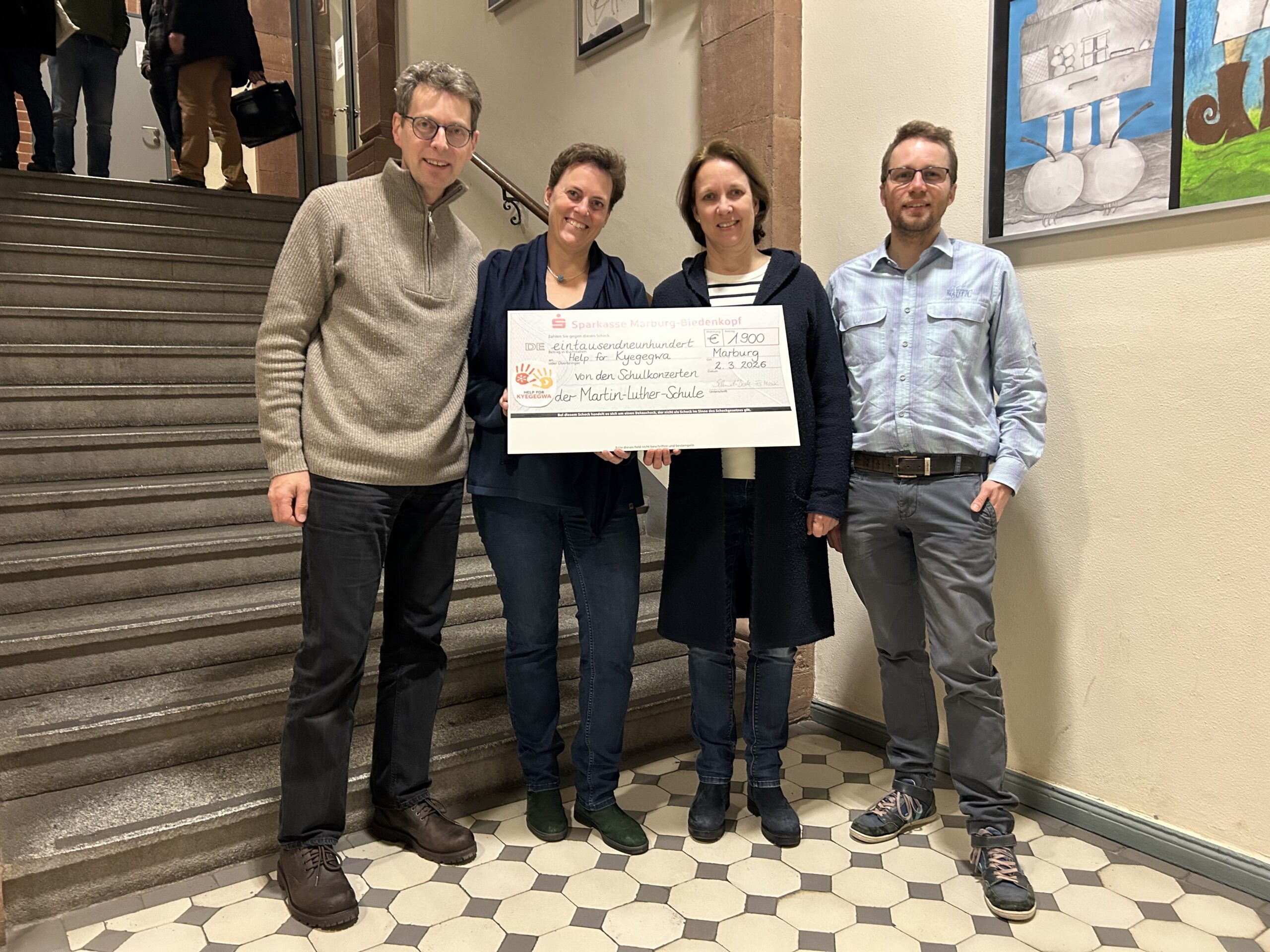 Bei den Schulkonzerten konnten wir in diesem Jahr zahlreiche Spenden einsammeln – die Fachschaft Musik und die Schulgemeinde sagt herzlichen Dank an alle Geberinnen und Geber. 1900€ gehen an den Verein „Help for Kyegegwa e.V.“ (https://www.help-for-kyegegwa.de/), welcher sich für die Verbesserung der Lebensbedingungen von Menschen in der Region Kyegegwa in Uganda einsetzt – Im Mittelpunkt steht hierbei eine Schule mit 770 Kindern und Jugendlichen.