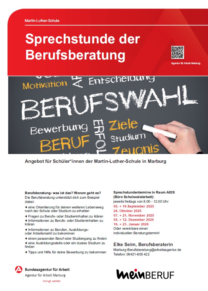 Angebot der Berufsberatung der Agentur für Arbeit Marburg: https://www.arbeitsagentur.de/vor-ort/marburg/berufsberatungu25